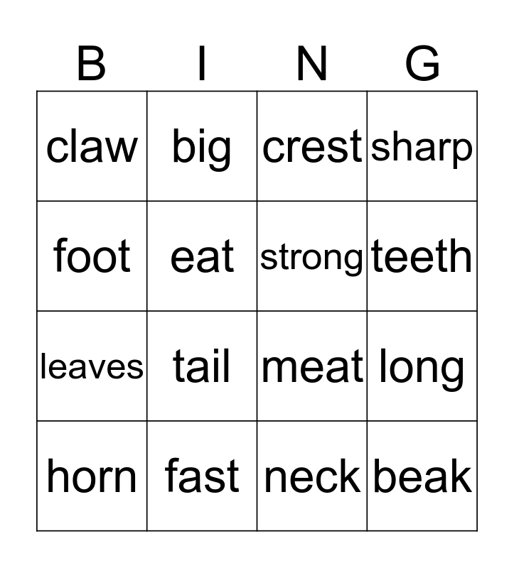 This bingo card has a free space and 15 words: horn, beak, crest, claw, teeth, foot, tail, neck, eat, leaves, long, sharp, strong, big and fast.