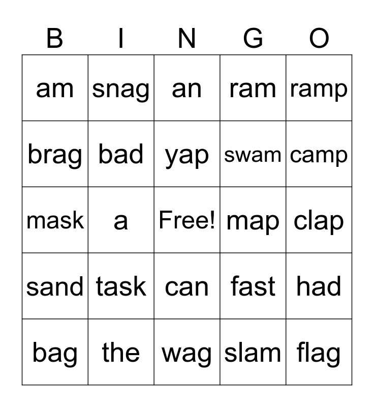 This bingo card has a free space and 30 words: the, I, a, said, am, an, bad, can, map, wag, clap, flag, slam, trap, camp, lamp, fast, sand, task, ramp, mask, land, snag, swam, brag, ram, had, bag, yap and past.