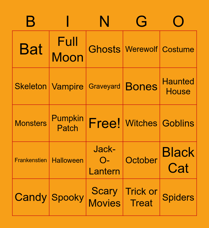 This bingo card has a free space and 24 words: Halloween, Spooky, Graveyard, Candy, Costume, Bat, Skeleton, Full Moon, Witches, Jack-O-Lantern, Bones, Monsters, October, Black Cat, Vampire, Trick or Treat, Goblins, Ghosts, Haunted House, Pumpkin Patch, Spiders, Frankenstien, Werewolf and Scary Movies.