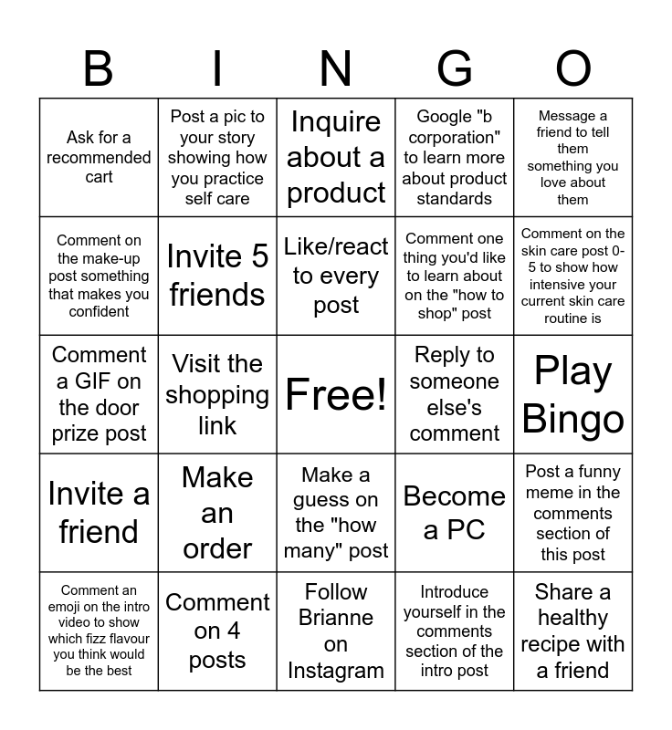 This bingo card has a free space and 24 words: Make an order, Comment on 4 posts, Like/react to every post, Comment an emoji on the intro video to show which fizz flavour you think would be the best, Message a friend to tell them something you love about them, Ask for a recommended cart, Comment on the make-up post something that makes you confident, Post a pic to your story showing how you practice self care, Reply to someone else's comment, Make a guess on the "how many" post, Comment one thing you'd like to learn about on the "how to shop" post, Comment a GIF on the door prize post, Become a PC, Post a funny meme in the comments section of this post, Invite 5 friends, Introduce yourself in the comments section of the intro post, Play Bingo, Inquire about a product, Comment on the skin care post 0-5 to show how intensive your current skin care routine is, Visit the shopping link, Share a healthy recipe with a friend, Invite a friend, Google "b corporation" to learn more about product standards and Follow Brianne on Instagram.