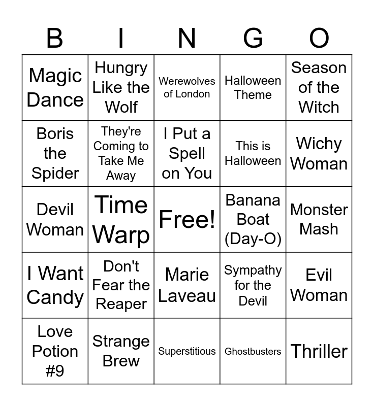 This bingo card has a free space and 34 words: Zombie, Ghostbusters, I Walk on Guilded Splinters, The Witch Queen of New Orleans, I Want Candy, They're Coming to Take Me Away, Season of the Witch, Love Potion #9, Hungry Like the Wolf, The Purple People Eater, I Put a Spell on You, Werewolves of London, Lil Red Riding Hood, Congo Square, Banana Boat (Day-O), Wichy Woman, Strange Brew, Devil Woman, Don't Fear the Reaper, Sympathy for the Devil, Marie Laveau, Black Magic Woman, Magic Dance, Monster Mash, Superstitious, Thriller, Halloween Theme, Bad Mooon Rising, This is Halloween, Boris the Spider, Jump in the Line, Time Warp, Evil Woman and Spooky.