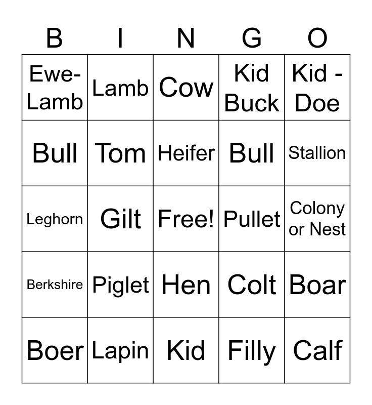 This bingo card has a free space and 50 words: Kit, Calf, Chick, Kid, Piglet, Foal, Lamb, Buck, Bull, Cockerel, Tom, Kid Buck, Boar, Colt, Ram-Lamb, Doe, Heifer, Pullet, Poult, Kid - Doe, Gilt, Filly, Ewe-Lamb, Bull, Rooster, Buck, Stallion, Ram, Cow, Hen, Doe, Sow, Mare, Ewe, Lapin, Steer, Capon, Wether, Gelding, Colony or Nest, Herd, Flock, Suffolk, New Zealand, Boer, Leghorn, Beltsville, Appaloosa, Berkshire and Angus.