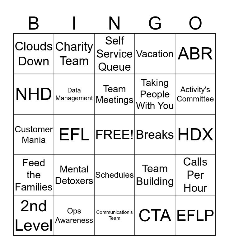 This bingo card has a free space and 25 words: Mental Detoxers, Communication's Team, Team Meetings, 2nd Level, ABR, Clouds Down, NHD, Charity Team, Breaks, Schedules, Taking People With You, Customer Mania, Team Building, Calls Per Hour, Data Management, Vendor Services, HDX, Self Service Queue, Activity's Committee, EFL, EFLP, Ops Awareness, Feed the Families, Vacation and CTA.
