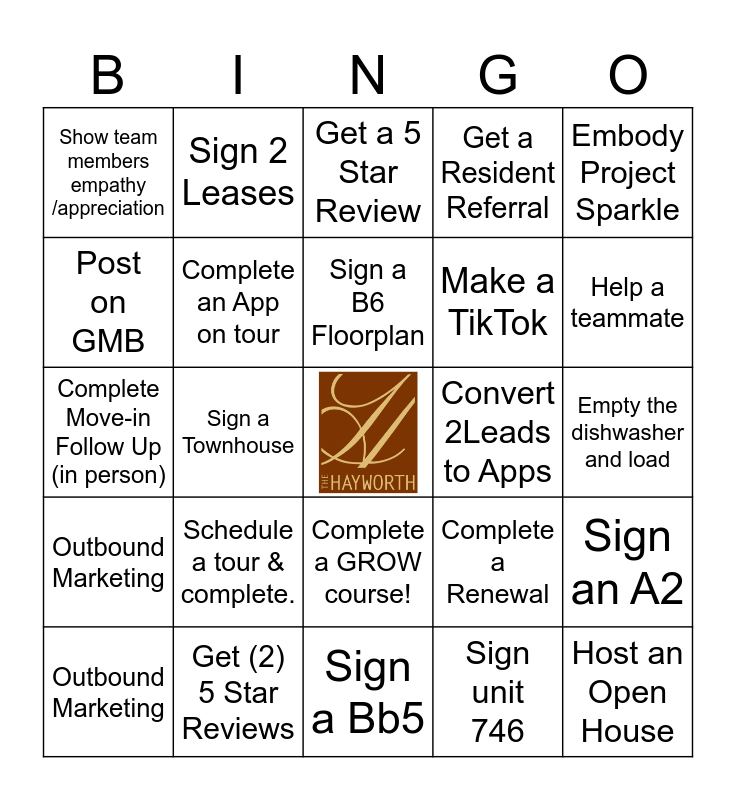 This bingo card has a free space and 24 words: Schedule a tour & complete., Get (2) 5 Star Reviews, Sign a B6 Floorplan, Outbound Marketing, Embody Project Sparkle, Show team members empathy /appreciation, Post on GMB, Sign 2 Leases, Convert 2Leads to Apps, Complete a GROW course!, Make a TikTok, Complete Move-in Follow Up (in person), Complete a Renewal, Sign an A2, Complete an App on tour, Sign unit 746, Empty the dishwasher and load, Get a 5 Star Review, Help a teammate, Sign a Townhouse, Host an Open House, Outbound Marketing, Get a Resident Referral and Sign a Bb5.