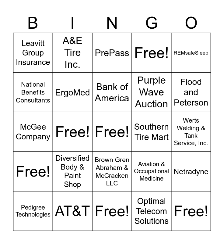 This bingo card has a free space and 24 words: Diversified Body & Paint Shop, AT&T, Bank of America, Pedigree Technologies, REMsafeSleep, Leavitt Group Insurance, National Benefits Consultants, A&E Tire Inc., Southern Tire Mart, Brown Gren Abraham & McCracken LLC, Purple Wave Auction, McGee Company, Aviation & Occupational Medicine, Netradyne, ErgoMed, Optimal Telecom Solutions, Werts Welding & Tank Service, Inc., PrePass, Flood and Peterson, Free!, Free!, Free!, Free! and Free!.