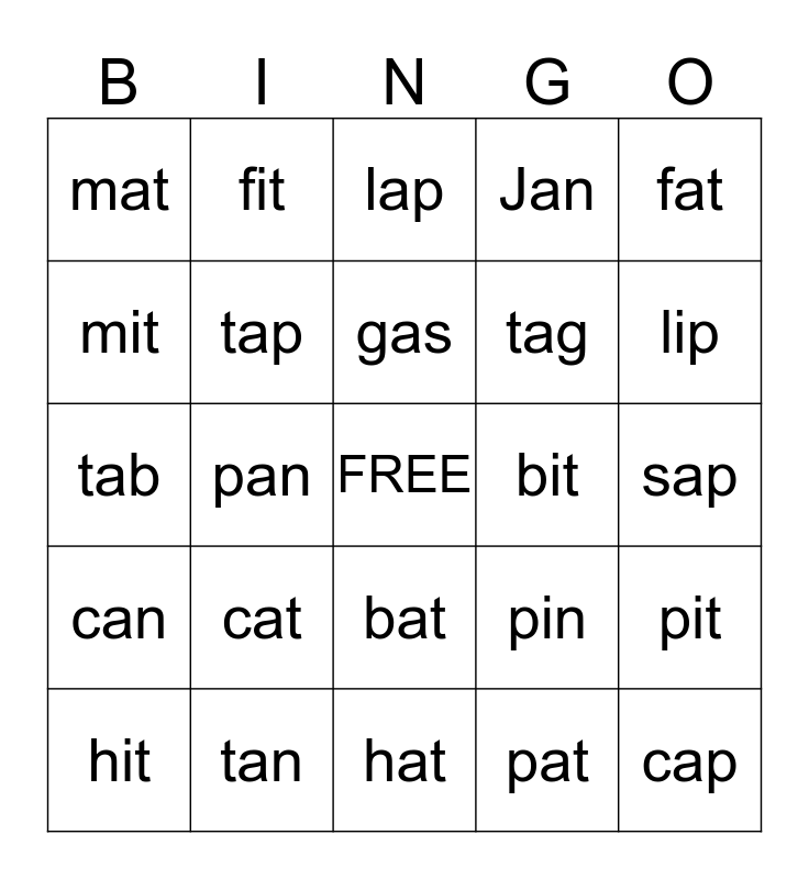 This bingo card has a free space and 24 words: cat, tan, gas, hit, fat, mat, mit, fit, bit, bat, tag, tab, pin, pit, tap, pat, sap, lap, lip, pan, cap, can, Jan and hat.