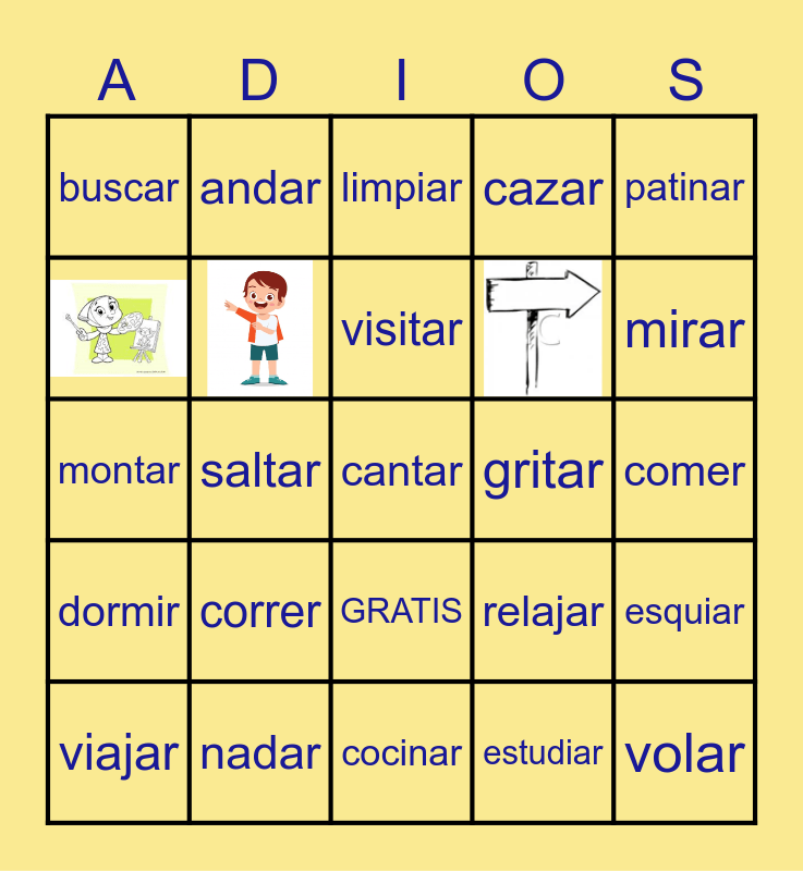 This bingo card has 5 images and 40 words: hablar, cantar, ayudar, viajar, jugar, estudiar, limpiar, pescar, patinar, nadar, cazar, gritar, GRATIS, correr, vender, cocinar, bailar, montar, escribir, mirar, andar, aprender, beber, buscar, caminar, comer, comprar, dibujar, relajar, dormir, escuchar, esquiar, hacer, lavar, leer, saltar, tocar, trabajar, volar and visitar.