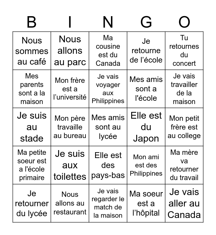 This bingo card has a free space and 24 words: Je suis aux toilettes, Nous allons au restaurant, Je vais voyager aux Philippines, Je retourner du lycée, Tu retournes du concert, Nous sommes au café, Mes parents sont a la maison, Nous allons au parc, Elle est du Japon, Elle est des pays-bas, Mes amis sont a l'école, Je suis au stade, Mon ami est des Philippines, Ma mère va retourner du travail, Mon frère est a l’université, Ma soeur est a l’hôpital, Mon petit frère est au college, Ma cousine est du Canada, Je vais travailler de la maison, Mon père travaille au bureau, Je vais aller au Canada, Ma petite soeur est a l'école primaire, Je retourne de l’école and Je vais regarder le match de la maison.