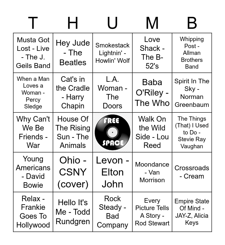 This bingo card has a free space and 41 words: How Bizarre - OMC, Why Can't We Be Friends - War, American Pie - Don McLean, Cat's in the Cradle - Harry Chapin, Hello It's Me - Todd Rundgren, Levon - Elton John, L.A. Woman - The Doors, Can't You See - The Marshall Tucker Band, Whipping Post - Allman Brothers Band, Young Americans - David Bowie, House Of The Rising Sun - The Animals, Love Shack - The B-52's, Empire State Of Mind - JAY-Z, Alicia Keys, The Things (That) I Used to Do - Stevie Ray Vaughan, Walk On the Wild Side - Lou Reed, Ohio - CSNY (cover), Imagine - John Lennon, Musta Got Lost - Live - The J. Geils Band, Karn Evil 9 - Emerson, Lake & Palmer, Smokestack Lightnin' - Howlin' Wolf, Crossroads - Cream, For What It's Worth - Buffalo Springfield, Rock Steady - Bad Company, Baba O'Riley - The Who, Have a Cigar - Pink Floyd, Fight For Your Right - Beastie Boys, Every Picture Tells A Story - Rod Stewart, Drift Away - Dobie Gray, Spirit In The Sky - Norman Greenbaum, Do Ya - Electric Light Orchestra, Gimme Shelter - The Rolling Stones, Hey Jude - The Beatles, Relax - Frankie Goes To Hollywood, Sledgehammer - Peter Gabriel, Moondance - Van Morrison, When a Man Loves a Woman - Percy Sledge, Hold Your Head Up - Argent, Diamonds on the Soles of Her Shoes - Paul Simon, Black Velvet - Alannah Myles, Son of a Preacher Man - Dusty Springfield and The Candy Man - Sammy Davis Junior.