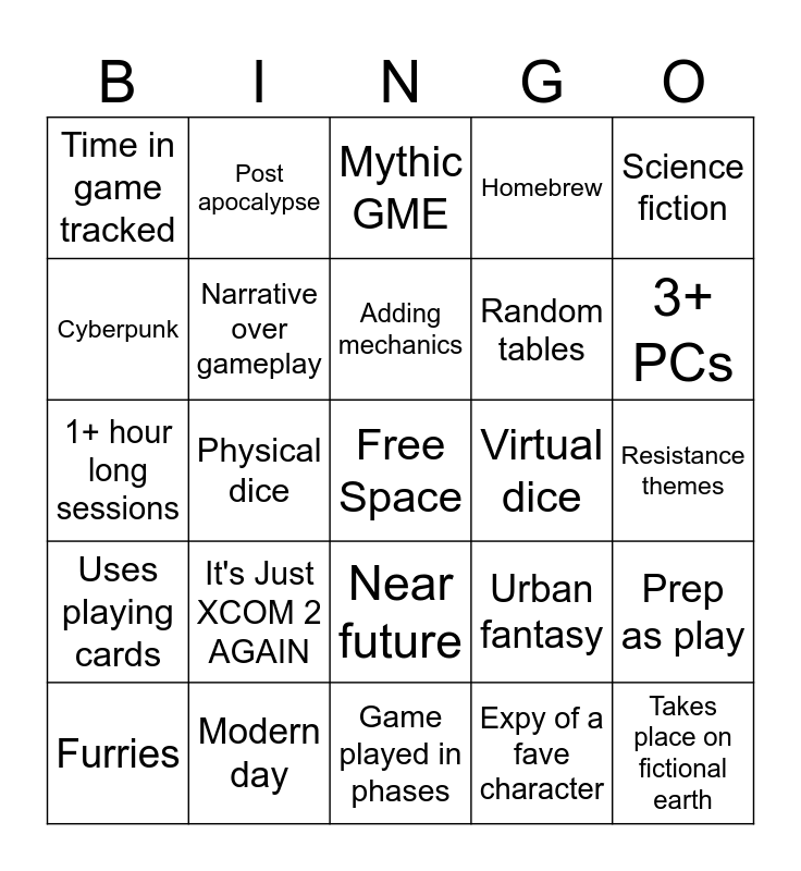 This bingo card has a free space and 24 words: It's Just XCOM 2 AGAIN, Modern day, Adding mechanics, Furries, Science fiction, Time in game tracked, Cyberpunk, Post apocalypse, Virtual dice, Near future, Random tables, 1+ hour long sessions, Urban fantasy, Prep as play, Narrative over gameplay, Expy of a fave character, Resistance themes, Mythic GME, 3+ PCs, Physical dice, Takes place on fictional earth, Uses playing cards, Homebrew and Game played in phases.