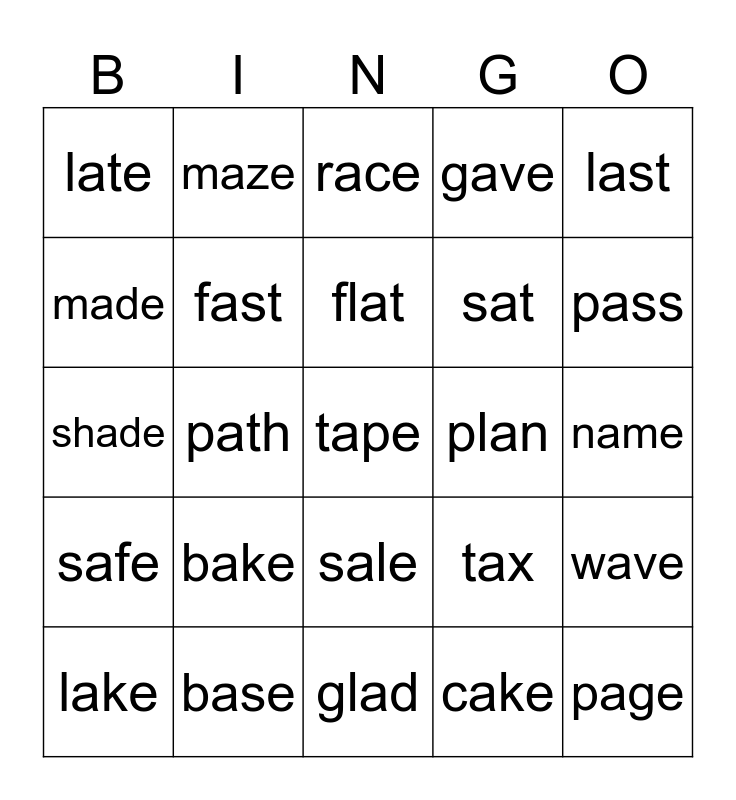 This bingo card has a free space and 24 words: bake, base, flat, lake, last, late, made, maze, plan, sale, sat, shade, tax, wave, fast, cake, name, race, pass, path, page, safe, gave and glad.