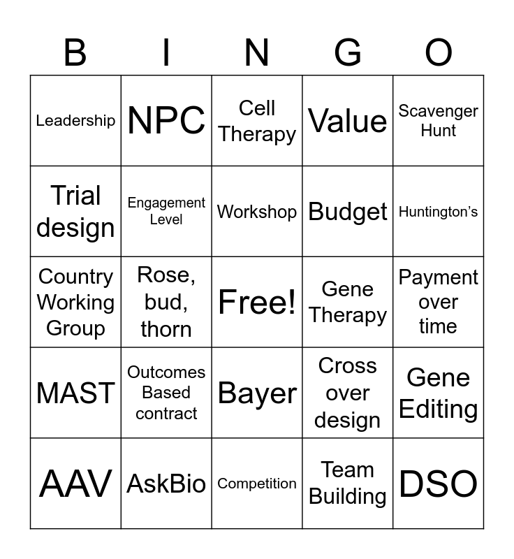 This bingo card has a free space and 60 words: News flow, AskBio, Bluerock, MAST, Team Building, Employee survey, Engagement Level, Feedback, Budget, Price, Value, MACs Strategic Pillars, Trial design, CRA, Capabilities, Leadership, DSO, Scavenger Hunt, Bio break, Workshop, Gene Therapy, Cell Therapy, AAV, Gene Editing, Parkinson’s, CHF, Pompe, Limb Girdle, Huntington’s, MSA, Medicare, Commercial Payer, HTA, Commercial Strategy and Operations, NPC, Medical Affairs, MACs, Rose, bud, thorn, Public Affairs, Country Working Group, Pricing, Outcomes Based contract, Payment over time, Annuity, Cross over design, Unmet Need, Target Patient, TPP, Sub population, Bayer, Competition, IPT, Orphan, Princess Tool, Comparator, Magnitude of benefit, Cost offsets, Business Case, Transparency and CART.