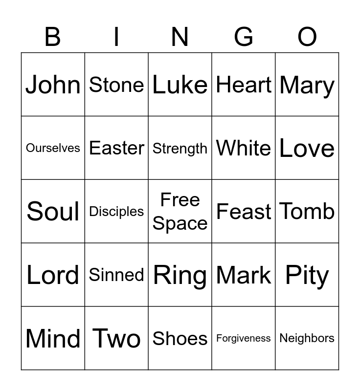 This bingo card has a free space and 24 words: Sinned, Two, Strength, Mind, Mary, John, Ourselves, Stone, Feast, Ring, White, Soul, Mark, Pity, Easter, Forgiveness, Tomb, Luke, Love, Disciples, Neighbors, Lord, Heart and Shoes.