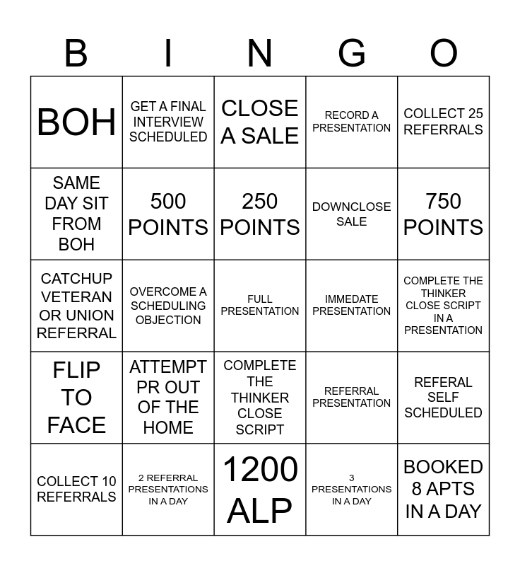 This bingo card has a free space and 24 words: COLLECT 10 REFERRALS, ATTEMPT PR OUT OF THE HOME, 250 POINTS, 3 PRESENTATIONS IN A DAY, COLLECT 25 REFERRALS, BOH, GET A FINAL INTERVIEW SCHEDULED, CLOSE A SALE, IMMEDATE PRESENTATION, COMPLETE THE THINKER CLOSE SCRIPT IN A PRESENTATION, CATCHUP VETERAN OR UNION REFERRAL, 500 POINTS, REFERRAL PRESENTATION, REFERAL SELF SCHEDULED, SAME DAY SIT FROM BOH, 2 REFERRAL PRESENTATIONS IN A DAY, 1200 ALP, RECORD A PRESENTATION, 750 POINTS, FLIP TO FACE, OVERCOME A SCHEDULING OBJECTION, COMPLETE THE THINKER CLOSE SCRIPT, DOWNCLOSE SALE and BOOKED 8 APTS IN A DAY.
