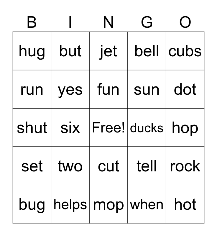 This bingo card has a free space and 24 words: two, helps, fun, bug, cubs, hug, run, but, ducks, cut, sun, shut, tell, rock, yes, when, hop, jet, dot, six, hot, set, bell and mop.