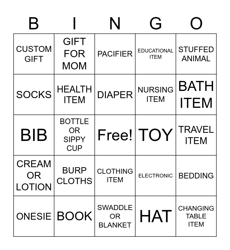 This bingo card has a free space and 24 words: BURP CLOTHS, BOOK, DIAPER, ONESIE, STUFFED ANIMAL, CUSTOM GIFT, SOCKS, GIFT FOR MOM, TOY, CLOTHING ITEM, NURSING ITEM, BIB, ELECTRONIC, BEDDING, HEALTH ITEM, HAT, TRAVEL ITEM, PACIFIER, BATH ITEM, BOTTLE OR SIPPY CUP, CHANGING TABLE ITEM, CREAM OR LOTION, EDUCATIONAL ITEM and SWADDLE OR BLANKET.
