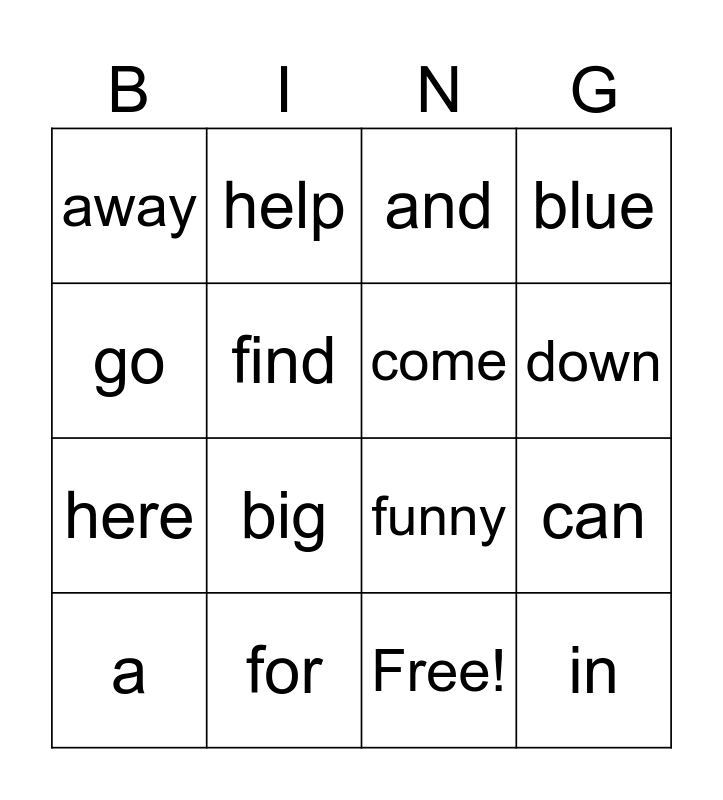 This bingo card has 17 words: Free!, a, and, away, big, blue, can, come, down, find, for, funny, go, help, here, I and in.