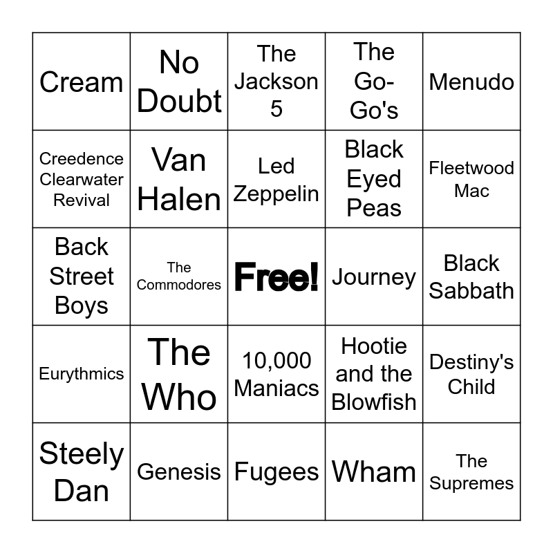 This bingo card has a free space and 27 words: Hootie and the Blowfish, Simon & Garfunkel, Black Eyed Peas, Fugees, Creedence Clearwater Revival, The Jackson 5, No Doubt, Eurythmics, Journey, Destiny's Child, Back Street Boys, The Go-Go's, Steely Dan, Genesis, Fleetwood Mac, Eagles, Van Halen, Led Zeppelin, The Who, Cream, Black Sabbath, Wham, The Commodores, The Supremes, 10,000 Maniacs, Menudo and The Police.
