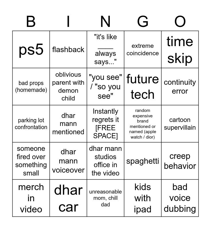 This bingo card has a free space and 24 words: dhar mann voiceover, dhar car, "you see" / "so you see", merch in video, time skip, ps5, bad props (homemade), flashback, random expensive brand mentioned or named (apple watch / dior), dhar mann studios office in the video, future tech, parking lot confrontation, spaghetti, creep behavior, oblivious parent with demon child, kids with ipad, cartoon supervillain, "it's like ____ always says...", continuity error, dhar mann mentioned, bad voice dubbing, someone fired over something small, extreme coincidence and unreasonable mom, chill dad.