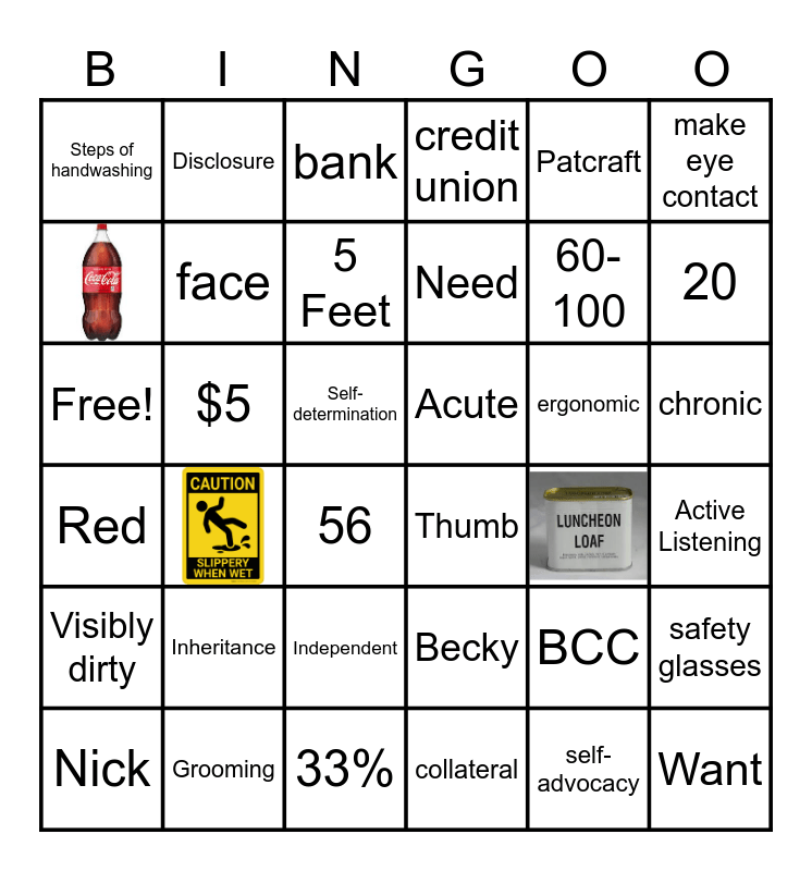 This bingo card has 3 images and 33 words: Becky, Independent, collateral, Red, Acute, face, 33%, Patcraft, BCC, 20, credit union, safety glasses, $5, Need, Steps of handwashing, Visibly dirty, ergonomic, Free!, bank, Self-determination, Thumb, 56, Disclosure, 60-100, Grooming, 5 Feet, make eye contact, Want, Nick, Active Listening, chronic, Inheritance and self-advocacy.