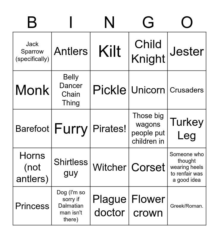 This bingo card has a free space and 40 words: Superhero, Barefoot, Legend of Zelda Shield, Belly Dancer Chain Thing, Dog (I'm so sorry if Dalmatian man isn't there), Witcher, Pickle, Game of Thrones, Jester, Horns (not antlers), Furry, Child Knight, Greek/Roman., Turkey Leg, Those big wagons people put children in, Shirtless guy, Someone wearing full garb and then athletic shoes, Jack Sparrow (specifically), Gandalf, Kilt, Someone who thought wearing heels to renfair was a good idea, Flower crown, Unicorn, Monk, Wizard, Wings, Drunk Guy™, Assassins Creed, Steampunk, Mermaid (or something vaguely mermaid themed, argue amongst yourselves), Cup hanging from belt, Princess, Fairies, Corset, Crusaders, Plague doctor, Harry Potter, Mushroom Hat, Antlers and Monty Python.