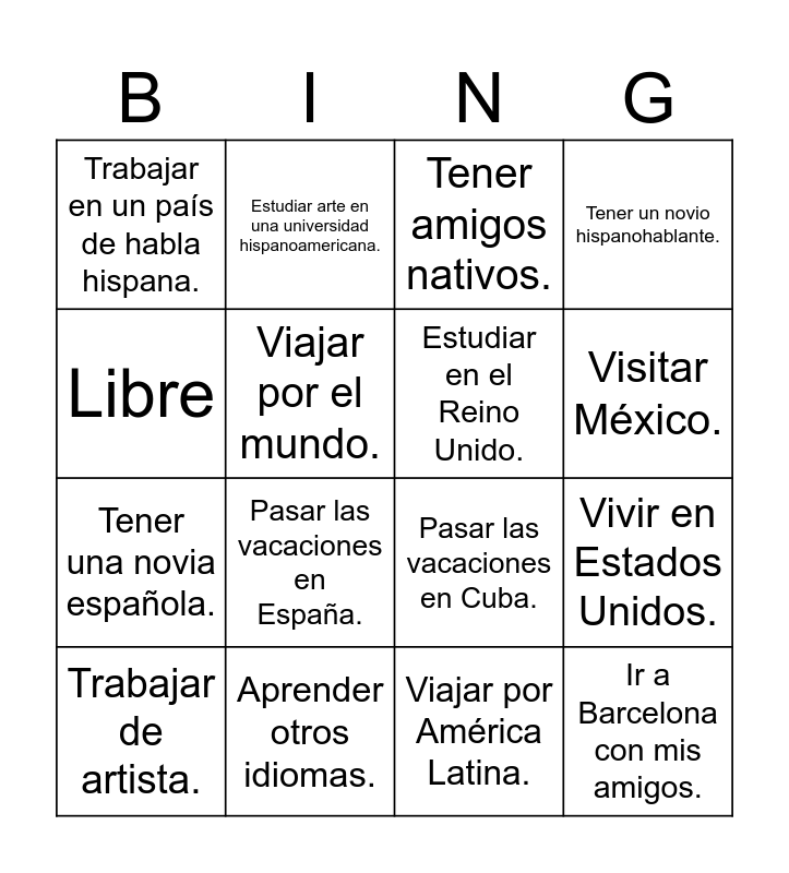 This bingo card has 16 words: Aprender otros idiomas., Vivir en Estados Unidos., Tener amigos nativos., Trabajar en un país de habla hispana., Tener una novia española., Estudiar arte en una universidad hispanoamericana., Pasar las vacaciones en Cuba., Viajar por América Latina., Libre, Viajar por el mundo., Trabajar de artista., Tener un novio hispanohablante., Pasar las vacaciones en España., Visitar México., Estudiar en el Reino Unido. and Ir a Barcelona con mis amigos..