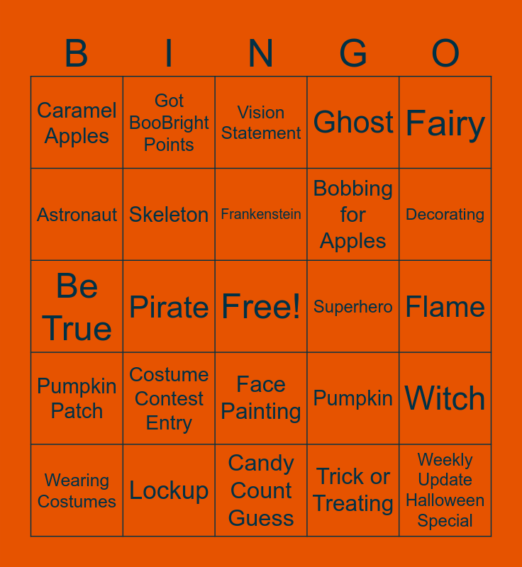 This bingo card has a free space and 46 words: Branded Zoom Background, Weekly Update Halloween Special, Branded LinkedIn Header, Candy Count Guess, Costume Contest Entry, Pumpkin Contest Entry, Got BooBright Points, Attended Brandoween Party, Astronaut, Black Cat, Skeleton, Ghost, Witch, Pumpkin, Vampire, Mummy, Frankenstein, Superhero, Spider, Fairy, Pirate, Trick or Treating, Caramel Apples, Bobbing for Apples, Haunted Houses, Decorating, Wearing Costumes, Carving Pumpkins, Face Painting, Pumpkin Patch, Eating Candy, Hay Rides, Squircle, Blanchard Green, Denim, Lockup, Flame, Wordmark, Barlow, Noto Sans, Tagline, Vision Statement, Be True, Scale Kindness, Transform Together and Relentless Pursuit.
