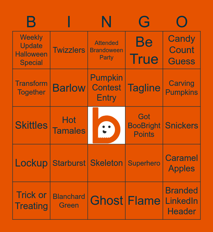 This bingo card has a free space and 59 words: Squircle, Blanchard Green, Denim, Lockup, Flame, Wordmark, Barlow, Noto Sans, Tagline, Vision Statement, Be True, Scale Kindness, Transform Together, Relentless Pursuit, Branded Zoom Background, Weekly Update Halloween Special, Branded LinkedIn Header, Candy Count Guess, Costume Contest Entry, Pumpkin Contest Entry, Got BooBright Points, Attended Brandoween Party, Trick or Treating, Caramel Apples, Bobbing for Apples, Haunted Houses, Decorating, Wearing Costumes, Carving Pumpkins, Face Painting, Pumpkin Patch, Eating Candy, Hay Rides, Candy Corn, Twizzlers, M&M, Red Vines, Hot Tamales, Rice Crispy Treats, Skittles, Sour Patch Kids, Starburst, Snickers, Fun Size, Mike & Ikes, Tootsie Pops, Astronaut, Black Cat, Skeleton, Ghost, Witch, Pumpkin, Vampire, Mummy, Frankenstein, Superhero, Spider, Fairy and Pirate.