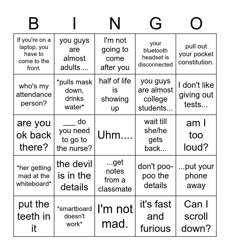 This bingo card has a free space and 24 words: the devil is in the details, *smartboard doesn't work*, half of life is showing up, put the teeth in it, pull out your pocket constitution., If you're on a laptop, you have to come to the front., who's my attendance person?, you guys are almost adults...., wait till she/he gets back..., ...get notes from a classmate, you guys are almost college students..., are you ok back there?, don't poo-poo the details, ...put your phone away, *pulls mask down, drinks water*, it's fast and furious, am I too loud?, I'm not going to come after you, I don't like giving out tests..., ___ do you need to go to the nurse?, Can I scroll down?, *her getting mad at the whiteboard*, your bluetooth headset is disconnected and I'm not mad..