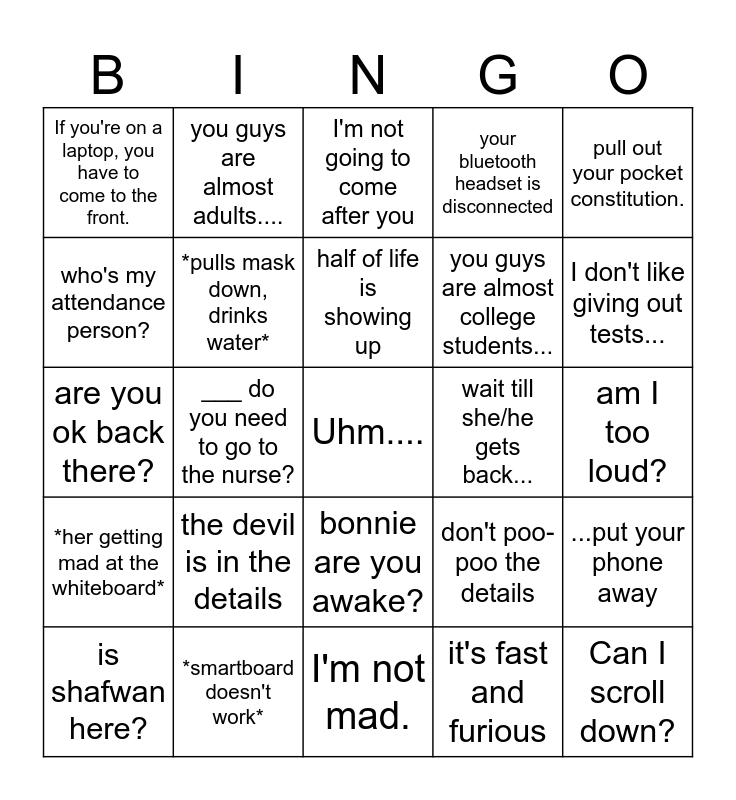 This bingo card has a free space and 24 words: the devil is in the details, *smartboard doesn't work*, half of life is showing up, is shafwan here?, pull out your pocket constitution., If you're on a laptop, you have to come to the front., who's my attendance person?, you guys are almost adults...., wait till she/he gets back..., bonnie are you awake?, you guys are almost college students..., are you ok back there?, don't poo-poo the details, ...put your phone away, *pulls mask down, drinks water*, it's fast and furious, am I too loud?, I'm not going to come after you, I don't like giving out tests..., ___ do you need to go to the nurse?, Can I scroll down?, *her getting mad at the whiteboard*, your bluetooth headset is disconnected and I'm not mad..