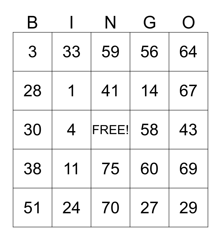 This bingo card has a free space and 24 words: 11, 24, 41, 51, 64, 3, 28, 33, 58, 75, 14, 30, 60, 69, 1, 27, 43, 59, 67, 4, 29, 38, 56 and 70.