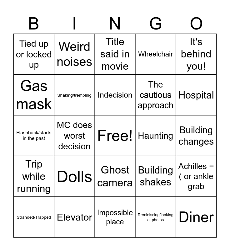 This bingo card has a free space and 141 words: Jumpscare, Dead Relative, Trying to contact the dead, Seance, Fortune Teller, Building shakes, Tells someone/Doesn’t believe them, Lullaby/nursery rhyme but creepy, Black person dies first, Psychic/Medium, Tarot, Ouija Board, Halloween, “Accidents”, Demon, Ghost, Possession, Door locks on it’s own, Someone gets murdered/killed, Ambiguous murder, Throat cut, Achilles =( or ankle grab, Cult, Creepy child, Door opens or closes, MC does worst decision, Weird noises, Inanimate object moving, The creepy head tilt, Object moves (like a doll or something), Inter-paranormal relationship, Insane person, Doomsday, Building changes, Flickering lights/lights go out/power outtage, Secret Passage, Ritual, Alternate realm/astral projection, The cautious approach, The slow villain walk, Candles, Fake scare (scared by something not scary), Ghost camera, Mutant, Animal detects presence/evil, Wedding dress, Going through a window, Near death experience, Creepy knock on the door, Old house/Mansion, Token Diverse Character, Token Queer Character, Stranded/Trapped, Stray Animal, Innuendo, Missing person/Disappearances, Dramatic Fainting, Vehicle Trouble/Dropped keys, Overhearing something you shouldn’t, Money Trouble, Couple fighting/Relatives fighting, Reminiscing/looking at photos, Useless First responders, Kids drawings, Premonition or vision, Trip while running, Waking up somewhere else, Eating not food, Fingernails, Improvised weapon, Torture, Tied up or locked up, Flashback/starts in the past, Lightning/Storm, Hallucinations, Flash view of killer, Paranormal writing, Footprints/handprints, Wheelchair, Asylum, Nightmare, Ambiguous ending, Exercise, Birth, Hospital, Found media, Haunting, Construction site/condemned, Impossible place, Imposter in communication, Lineage, Mental illness, False hope, Elevator, Ghost hunters, Knowing things you shouldnt, Religious symbols, Sacrilegious symbol, Abusive parent, Creaking building, Gas mask, Creepy hand, Eyes rolling back, Scars, Indecision, Virginity/puberty, Symbolism, Rape themes, Hearing voices, Dolls, Nobody is there, Under bed, It's behind you!, Diner, Lost connections, Shaking/trembling, Pitch black/the void, Getting separated, Suicide, Guns, Stabbing cutting slashing, Unnatural movement, Reaching into stupid places, Kidnapping, Serial killer, Found remains, Crawlspace, Hypnotized or mind control brainwashing, Packing/ unpacking/ moving, Creepy attic/ basement, Creepy clock/ piano, Dripping, Supplemental lights, Walkby shadow, Creepy music on or off, There but not there, Title said in movie, Amnesia/ repressed memories, Twist, There then not there and Not listening to directions.