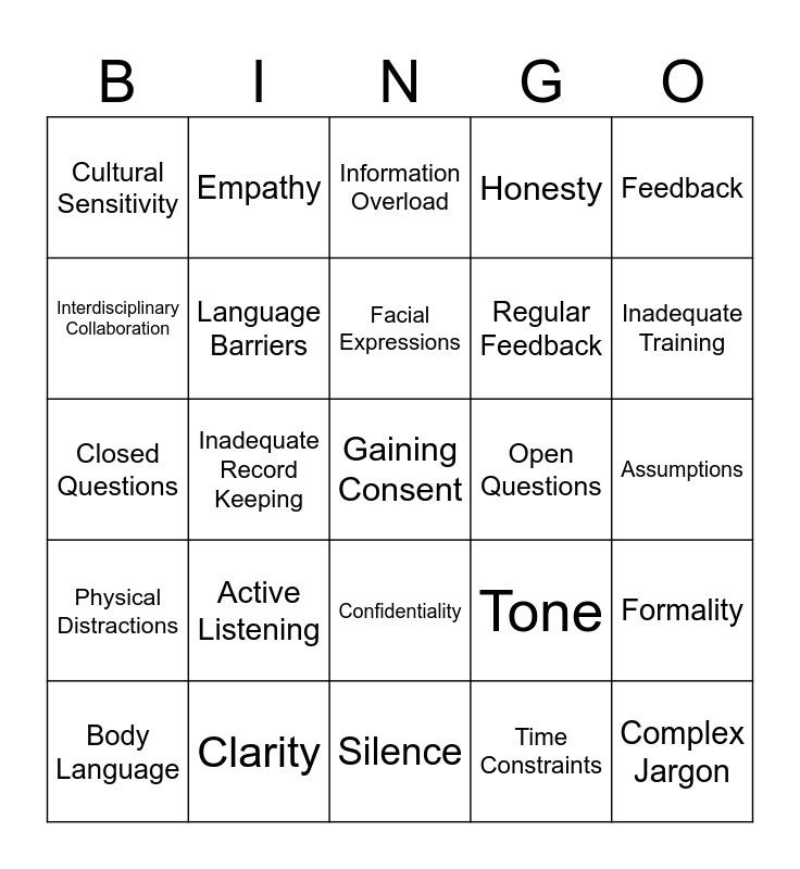 This bingo card has a free space and 24 words: Active Listening, Clarity, Facial Expressions, Body Language, Feedback, Cultural Sensitivity, Interdisciplinary Collaboration, Empathy, Open Questions, Confidentiality, Regular Feedback, Closed Questions, Tone, Formality, Language Barriers, Time Constraints, Assumptions, Information Overload, Inadequate Training, Inadequate Record Keeping, Complex Jargon, Physical Distractions, Honesty and Silence.
