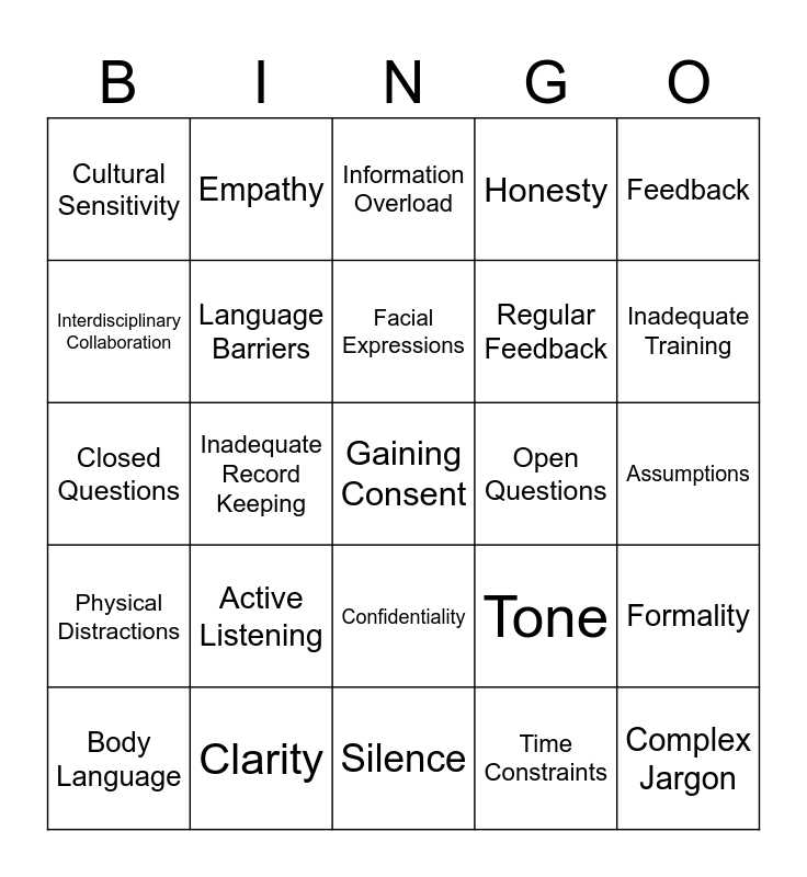 This bingo card has a free space and 24 words: Active Listening, Clarity, Facial Expressions, Body Language, Feedback, Cultural Sensitivity, Interdisciplinary Collaboration, Empathy, Open Questions, Confidentiality, Regular Feedback, Closed Questions, Tone, Formality, Language Barriers, Time Constraints, Assumptions, Information Overload, Inadequate Training, Inadequate Record Keeping, Complex Jargon, Physical Distractions, Honesty and Silence.