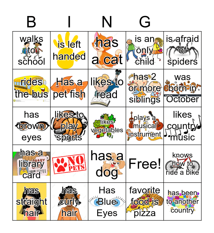 This bingo card has 24 images and 24 words: Has Blue Eyes, likes to read, has straight hair, is afraid of spiders, walks to school, rides the bus, is left handed, plays a musical instrument, has a dog, has 2 or more siblings, has brown eyes, Free!, knows how to ride a bike, Has a pet fish, has been to another country, likes country music, has a cat, was born in October, likes to play sports, likes vegetables, has curly hair, has a library card, is an only child and favorite food is pizza.