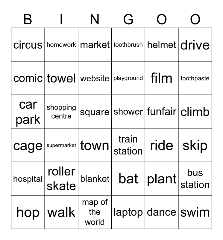 This bingo card has 36 words: bat, blanket, laptop, comic, cage, shower, towel, map of the world, helmet, plant, toothpaste, toothbrush, bus station, shopping centre, playground, circus, hospital, funfair, car park, market, square, supermarket, train station, town, ride, homework, film, walk, website, drive, swim, hop, skip, climb, roller skate and dance.