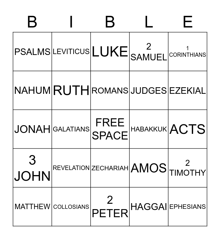 This bingo card has a free space and 24 words: REVELATION, COLLOSIANS, ROMANS, MATTHEW, 1 CORINTHIANS, PSALMS, NAHUM, LEVITICUS, HABAKKUK, ZECHARIAH, JUDGES, JONAH, AMOS, 2 TIMOTHY, RUTH, HAGGAI, ACTS, LUKE, EZEKIAL, GALATIANS, EPHESIANS, 3 JOHN, 2 SAMUEL and 2 PETER.