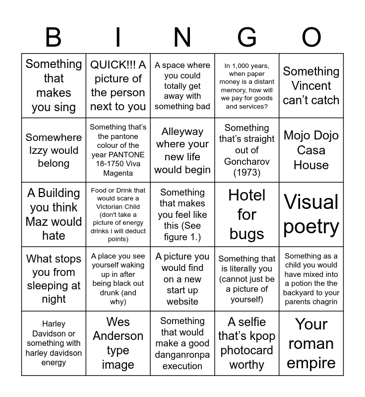 This bingo card has 70 words: Free!, A Building you think Maz would hate, Something that inspires you in humanities whimsy, Family values, Hotel for bugs, Prime specimen, role model for the species (your choice of species), Something that makes you sing, Street corner you would leave your past behind on, Alleyway where your new life would begin, Sarcastic gift for a scorned lover, Total waste of space >:(, Recreate an advertisement space, QUICK!!! A picture of the person next to you, A space where you could totally get away with something bad, The modern youths one true necessity, Something as a child you would have mixed into a potion the the backyard to your parents chagrin, Harley Davidson or something with harley davidson energy, Something that’s the pantone colour of the year PANTONE 18-1750 Viva Magenta, A space that would make a sick escape room, Something that’s straight out of Goncharov (1973), Your roman empire, Graffiti that made you do a double take for real, Food or Drink that would scare a Victorian Child (don't take a picture of energy drinks i will deduct points), A picture you would find on a new start up website, A pose that represents the Fall of Icarus (not literal, show me hubris), A place you think Sydney would be better without, A place where you would do a Random Play Dance/Tiktok (5+ if there’s video of you fully attempting this), Somewhere unexpected that you think Ed Sheeran would perform at, Something that makes you feel like this (See figure 1.), A sticker that would belong in Cate’s sticker journal, Something Vincent can’t catch, Something that makes you feel like this (See Figure 2.), Something that would make you change your career path over, Something that belongs in Floriade™️, The one thing that makes you feel patriotic for australia, Something that makes you feel incredibly paranoid, Something that’s changed from your childhood, A fun new Vivid™️ attraction!, Something that would make a good danganronpa execution, In 1,000 years, when paper money is a distant memory, how will we pay for goods and services?, A place where you would release your inner wolf (See figure 3.), What stops you from sleeping at night, A place you see yourself waking up in after being black out drunk (and why), A sight that would look good snowed over, Barbie bus or something that reminds you of the barbie bus, Mojo Dojo Casa House, A scene from a music video, Something that could take dance to the next level, Something that could fundamentally change who you are, Music 2, Something you want so bad but will never have…………., Hottest person you've ever seen on an advertisement sign, Wes Anderson type image, An advertisement that worked, Something that is literally you (cannot just be a picture of yourself), Something that Alex would wikipedia after today’s over, Somewhere Izzy would belong, Somewhere you wouldn’t be caught dead in, Only in Sydney!!, A selfie that’s kpop photocard worthy, Visual poetry, A hill you'd die on (extra points if you mean it), Something unexpected that would turn into a crippling collecting addiction, Something you wouldn't touch with a hazmat suit on, Man vs beast, A New Pokemon (bonus points if u give it a typing), An item of clothing you'd see a character from Jojo's Bizarre Adventure wearing, Trail cam footage type image of a new cryptid (think loch ness monster hoax), One image tragedy (think baby shoes for sale) and Cover art for the next Taylor Swift album.