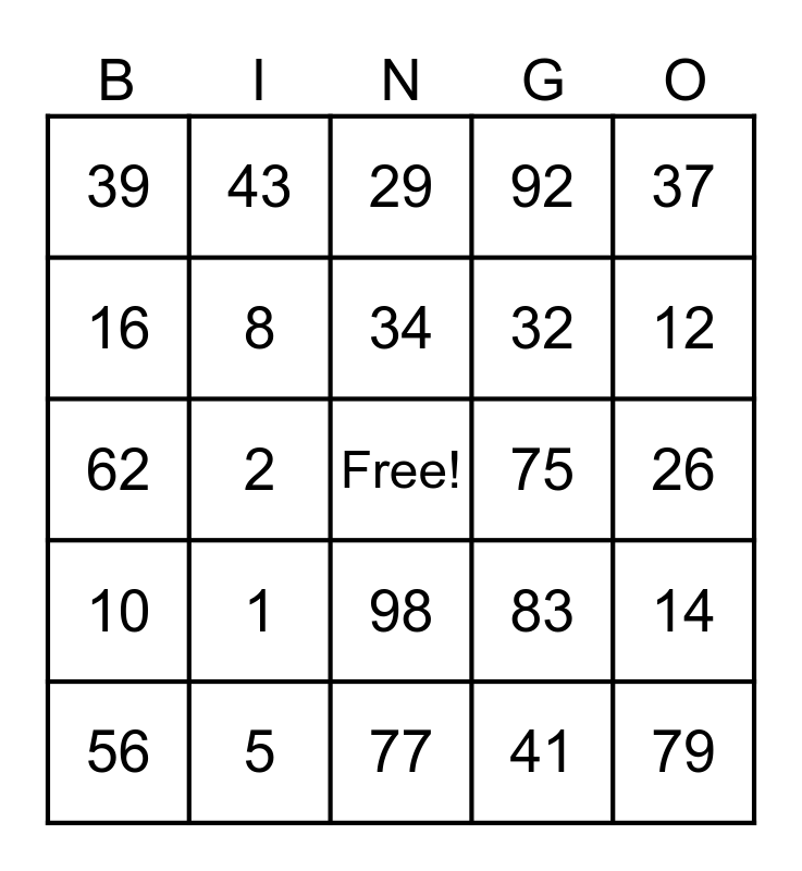 This bingo card has a free space and 24 words: 1, 5, 34, 56, 37, 39, 16, 43, 75, 98, 32, 62, 83, 14, 8, 41, 26, 29, 12, 2, 79, 10, 92 and 77.