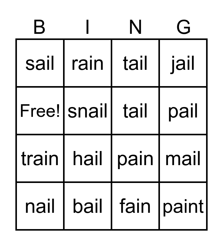 This bingo card has 16 words: bail, mail, tail, sail, train, rain, pain, fain, Free!, snail, nail, jail, hail, pail, tail and paint.