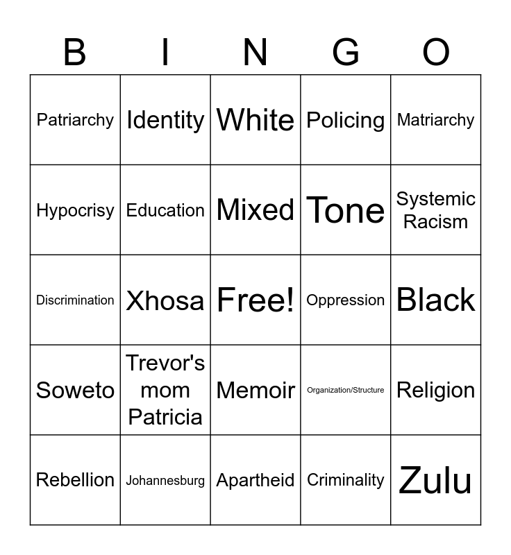 This bingo card has a free space and 25 words: Trevor's mom Patricia, Apartheid, Mixed, Rebellion, Matriarchy, Patriarchy, Hypocrisy, Identity, Oppression, Memoir, Tone, Discrimination, Organization/Structure, Religion, Education, Trevor's father, Black, White, Systemic Racism, Xhosa, Zulu, Johannesburg, Soweto, Policing and Criminality.