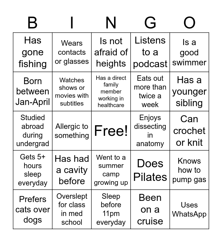 This bingo card has a free space and 27 words: Does Pilates, Uses an electric toothbrush, Eats out more than twice a week, Sleep before 11pm everyday, Born between Jan-April, Is not afraid of heights, Wears contacts or glasses, Gets 5+ hours sleep everyday, Enjoys dissecting in anatomy, Knows how to pump gas, Studied abroad during undergrad, Listens to a podcast, Prefers cats over dogs, Overslept for class in med school, Has a younger sibling, Has a sweet tooth, Watches shows or movies with subtitles, Has a direct family member working in healthcare, Has had a cavity before, Has gone fishing, Can crochet or knit, Been on a cruise, Allergic to something, Uses WhatsApp, Went to a summer camp growing up, Is a good swimmer and Not afraid of spiders.