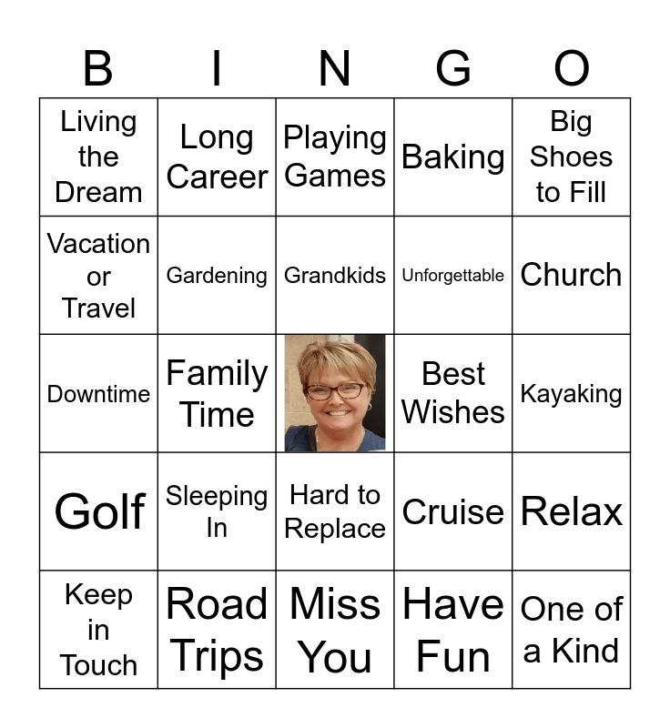 This bingo card has a free space and 25 words: Sleeping In, Miss You, Grandkids, Keep in Touch, Big Shoes to Fill, Living the Dream, Vacation or Travel, Long Career, Best Wishes, Hard to Replace, Unforgettable, Downtime, Cruise, Relax, Gardening, Camping, Kayaking, Playing Games, Church, Family Time, One of a Kind, Road Trips, Golf, Baking and Have Fun.