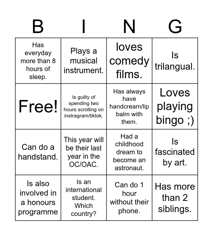 This bingo card has 16 words: Is an international student. Which country?, Is fascinated by art., loves comedy films., Has everyday more than 8 hours of sleep., Can do a handstand., Plays a musical instrument., Had a childhood dream to become an astronaut., Can do 1 hour without their phone., Free!, Is guilty of spending two hours scrolling on instragram/tiktok., Is also involved in a honours programme, Is trilangual., This year will be their last year in the OC/OAC., Loves playing bingo ;), Has always have handcream/lip balm with them. and Has more than 2 siblings..