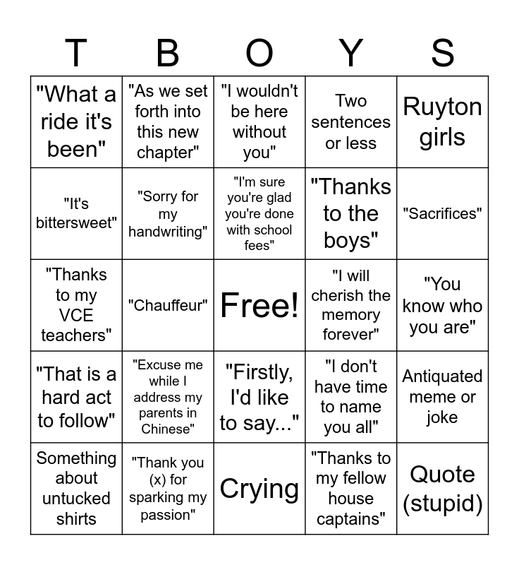 This bingo card has a free space and 25 words: "Excuse me while I address my parents in Chinese", Crying, "I'm sure you're glad you're done with school fees", Something about untucked shirts, Ruyton girls, "What a ride it's been", "It's bittersweet", "As we set forth into this new chapter", "I will cherish the memory forever", "Firstly, I'd like to say...", "Thanks to the boys", "Thanks to my VCE teachers", "I don't have time to name you all", Antiquated meme or joke, "Sorry for my handwriting", "Boys, good luck on your exams", "You know who you are", "I wouldn't be here without you", "Sacrifices", "Chauffeur", Quote (stupid), "Thank you (x) for sparking my passion", "That is a hard act to follow", Two sentences or less and "Thanks to my fellow house captains".