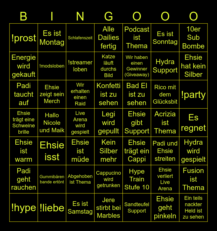 This bingo card has 49 words: Ehsie verliert Live Arena, Hydra Support, Sandteufel Support, Hallo Nicole und Maik, Wir erhalten einen Raid, Es regnet, Es ist Montag, Es ist Samstag, Es ist Sonntag, Kein Silber mehr, 10er Sub Bombe, Alle Dailies fertig, Rico mit dem Glücksbit, Bad El ist zu sehen, Gummibären bande ertönt, Acrizia ist Thema, Energie wird gekauft, Ehsie hat kein Silber, Fusion ist Thema, Podcast ist Thema, Wir haben einen Gewinner (Giveaway), Live Arena wird gespielt, !prost, !modsloben, !hype, !streamer loben, !party, !liebe, Konfetti ist zu sehen, Ehsie zeigt sein Merch, Ein teils nackter Held ist zu sehen, Ehsie gibt Support, Padi geht rauchen, Abgehoben ist Thema, Ehsie trägt eine Schweine brille, Ehsie trägt ein Cappi, Padi und Ehsie streiten, Hydra wird gespielt, Padi taucht auf, Ehsie ist müde, Cappucino wird getrunken, Ehsie ist warm, Legi wird gepullt, Jere stirbt bei Marbles, Katze läuft durchs Bild, Schlafenszeit, Hype Train Stufe 10, Ehsie isst and Ehsie geht pinkeln.