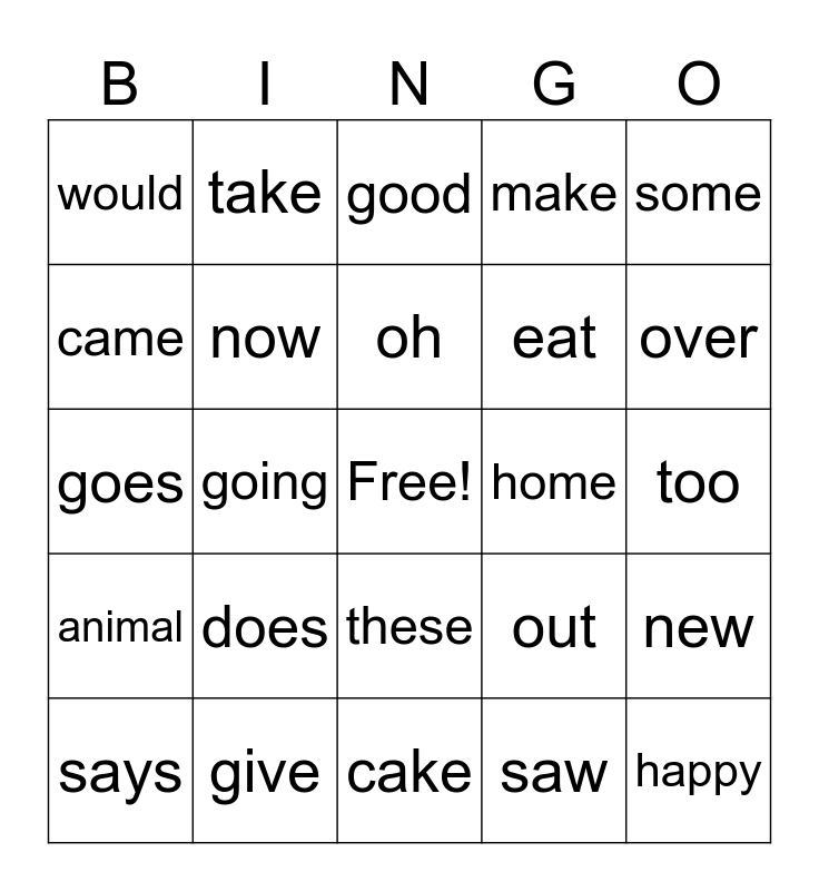 This bingo card has a free space and 24 words: does, give, oh, says, some, would, came, take, home, these, eat, goes, out, new, now, saw, too, good, over, going, happy, animal, make and cake.