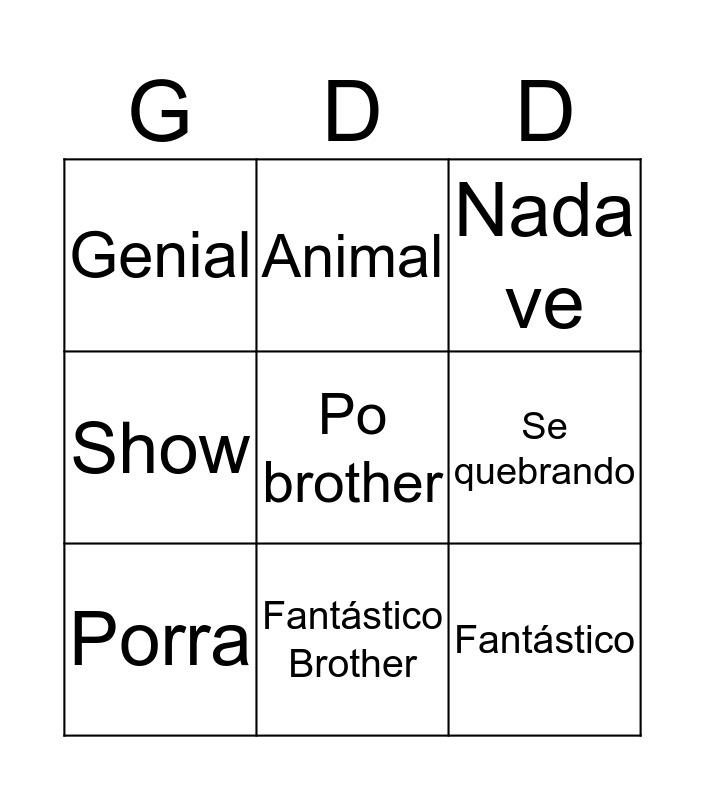 This bingo card has 11 words: Fantástico, Fantástico Brother, Po brother, Porra, Animal, Nada ve, Se quebrando, Matou a pau, Show, Genial and GDD.