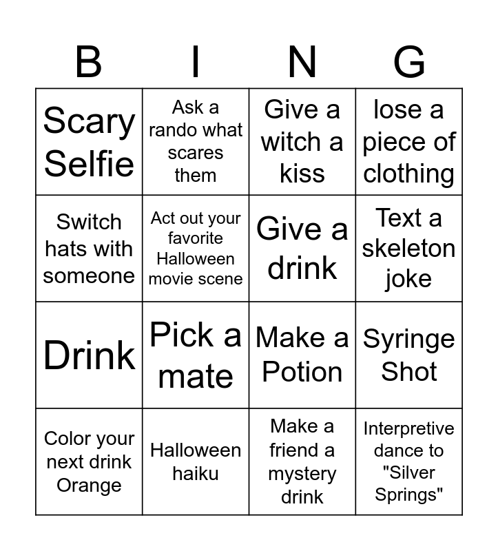 This bingo card has 25 words: Free!, Demonstrate a violent death, Text a skeleton joke, Best runway walk, Switch hats with someone, Scary Selfie, Act out your favorite Halloween movie scene, Ask a rando what scares them, Halloween haiku, Evil Witch Laugh, Drink, Make a Potion, Ride around on the broom, Sexy Witch Dance, Give a drink, Seduce the Skeleton, Make a friend a mystery drink, Give a witch a kiss, Pick a mate, Syringe Shot, Color your next drink Orange, Drink x2, Interpretive dance to "Silver Springs", lose a piece of clothing and ride the bus.