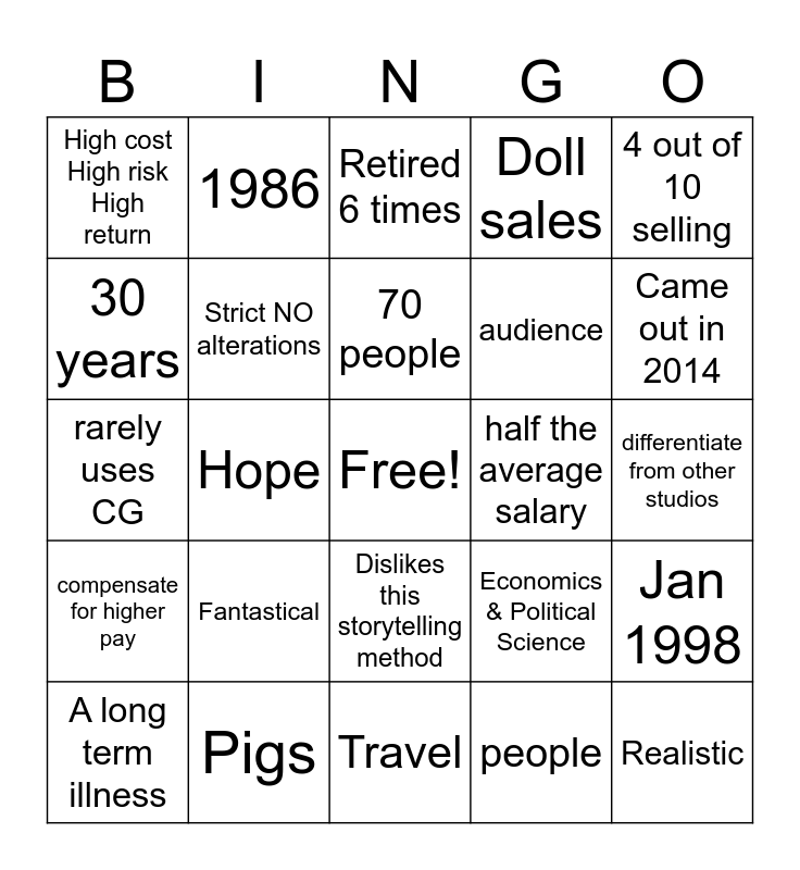 This bingo card has a free space and 27 words: Economics & Political Science, Hot wind blowing, audience, Travel, 30 years, Retired 6 times, 1986, compensate for higher pay, half the average salary, Jan 1998, rarely uses CG, Doll sales, A long term illness, Pigs, Came out in 2014, designed using storyboards, Strict NO alterations, 70 people, Fantastical, High cost High risk High return, differentiate from other studios, people, Hope, Realistic, Dislikes this storytelling method, 4 out of 10 selling and Airplanes.